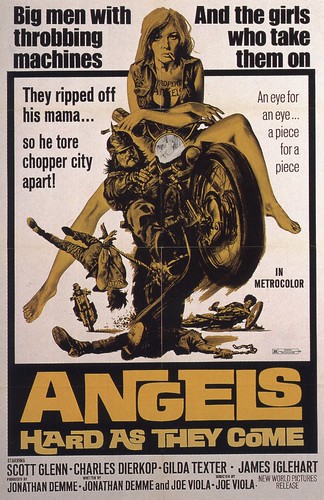 Gia che ci siamo, maglietta! La Levi’s ha fatto una collezione di magliette con la stampa di locandine di film horror anni ‘70. Non oso pensare quanto trash siano. Comunque, ho optato per quella del film Angels hard as they come (vedi locandina, clicca per ingrandire), colore blu slavato e grigio. E infine, la tracolla. Ho acquistato il modello Reflective DJ bag della Manhattan Portage, marchio specializzato nella produzione di borse e zaini da sempre. Fanno le borse dei pony express newyorkesi per capirci. E la scelta della borsa denominata “DJ” è stata casuale, l’ho scoperto a posteriori, non c’entra la mia lavoropassione. E’ molto semplice: tutta nera, etichetta rossa (un must della marca e dei suoi fan) e banda rifrangente che fa tanto pony express metropolitano (fa anche tanto postino ma preferisco la prima definizione).